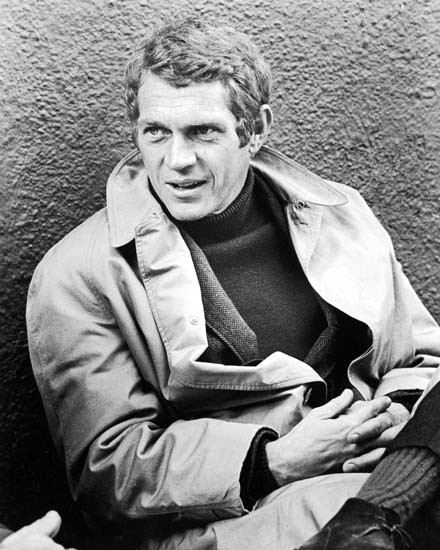Steve McQueen relaxes on Bullitt set wearing raincoat & polo neck