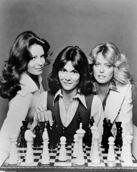 Charlie's Angels TV series Farrah Jaclyn & Kate pose by chess board