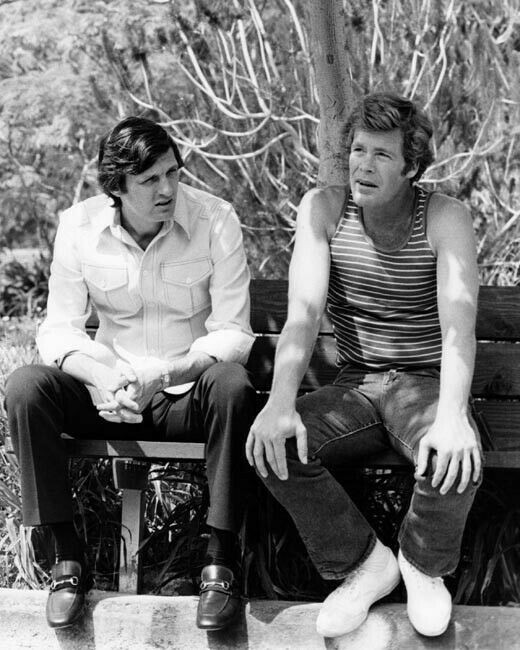 Playmates 1972 TV movie Doug McClure Alan Alda sitting on bench 8x10 photo