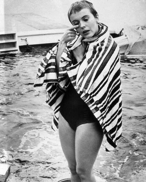 Jean Seberg in black swimsuit with towel around shoulders 8x10 inch photo