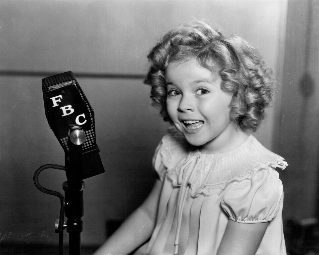 Shirley Temple stands in front of FBC microphone radio broadcast 8x10 inch photo