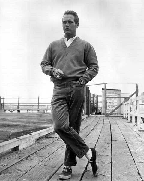 Paul Newman full length casual pose in v-neck sweater & sneakers 8x10 photo
