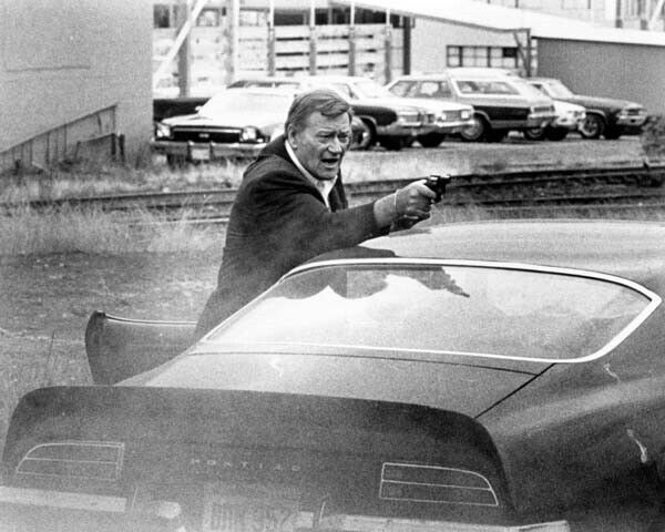 John Wayne takes aim with gun over his Pontiac Grand-Am 1974 McQ 8x10 photo