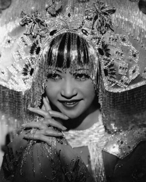 Anna Mae Wong clasps hands together smiling in elaborate head dress 8x10 photo