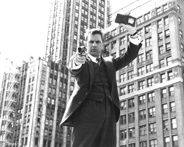 Kevin Costner holds up FBI badge & points gun 1987 The Untouchables 8x10 photo