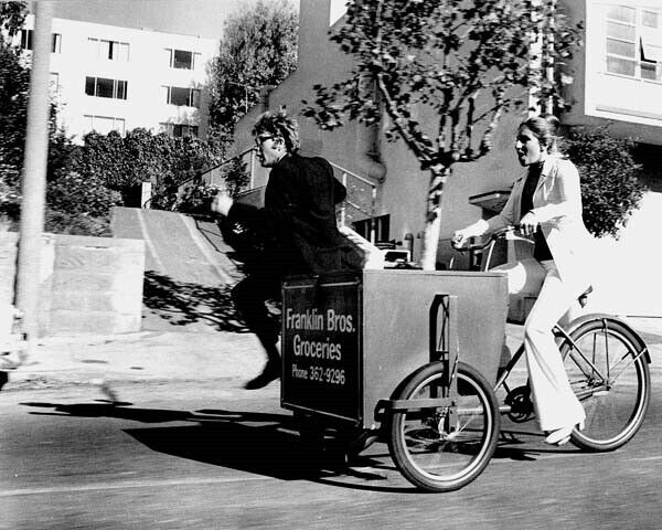 What's Up Doc Barbra Streisand peddles cart Ryan O'Neal running 8x10 inch photo