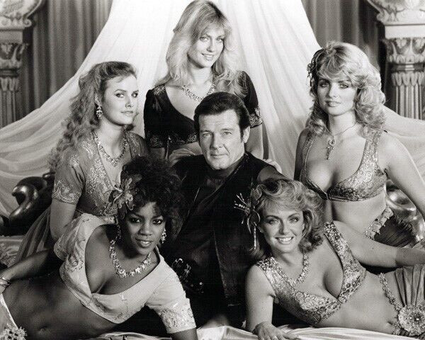 Octopussy Roger Moore poses with Bond girls 8x10 inch photo