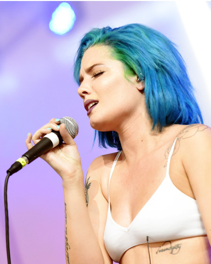 Halsey singing in white bra top blue hair tattoos 8x10 Photo