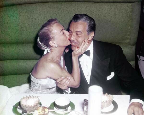 Joan Crawford plants kiss on cheek of Cesar Romero 1950's Hollywood 8x10 photo