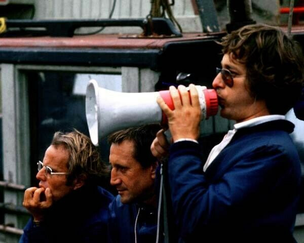 Jaws director Steven Spielberg talks thru megaphone Roy Scheider beside him 8x10