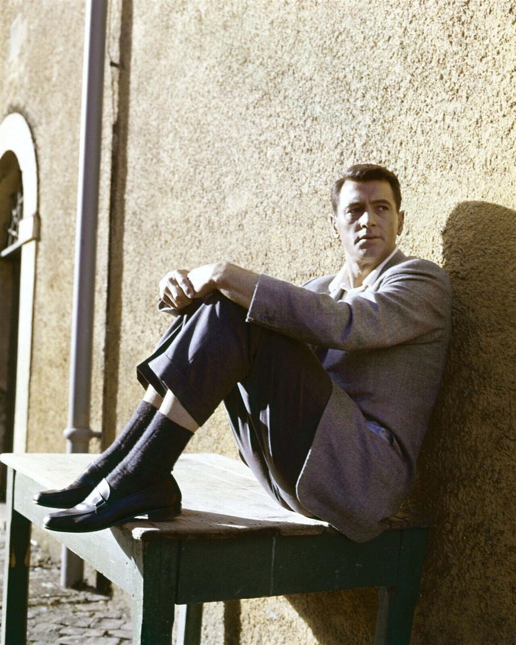 Rock Hudson early 1960's candid leans against wall sat on table 8x10 inch photo