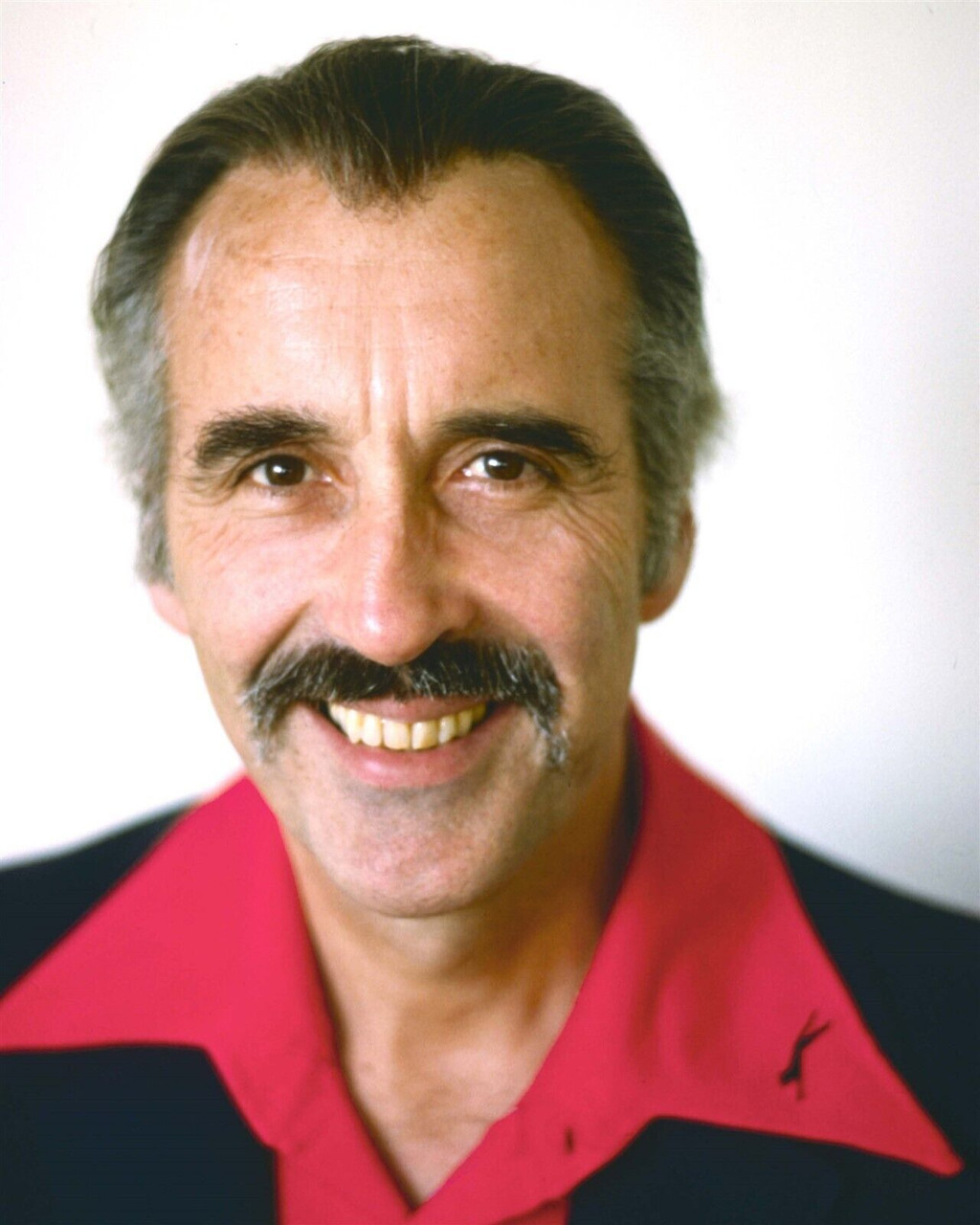 Christopher Lee 70's era smiling portrait with moustache in red shirt 8x10 photo