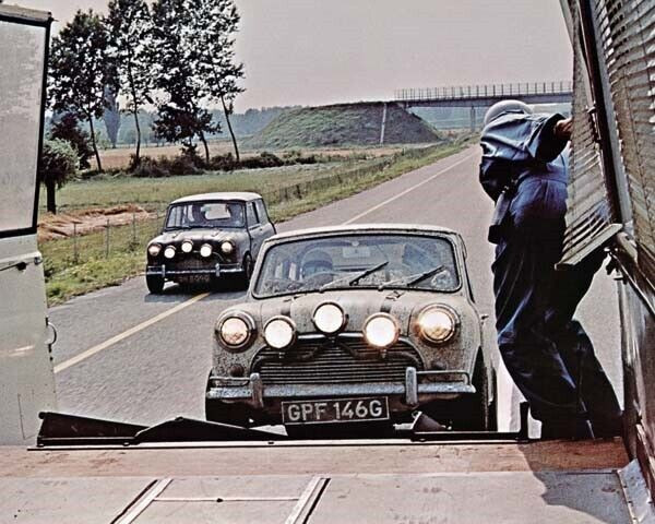 The Italian Job 1969 Mini Cooper on ramp enters van on highway 8x10 photo