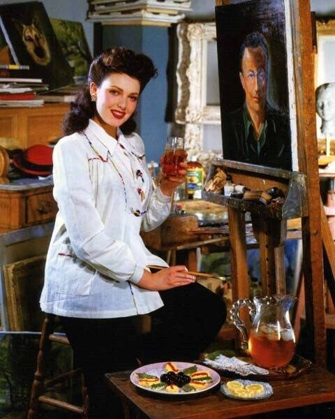 Linda Darnell 1940's enjoying drink whilst painting in studio 8x10 inch photo