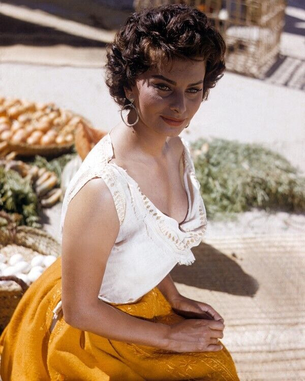 Sophia Loren 1957 in low cut white blouse and yellow skirt 8x10 inch photo