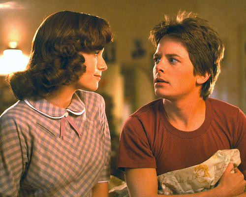 An image of Michael J. Fox as Marty McFly and Lea Thompson as Lorraine Baines in Back to the Future available as a poster, photograph or aluminum metal print. Your satisfaction guaranteed.