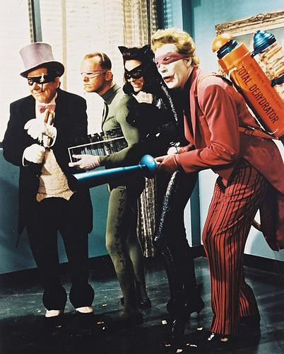 An image of Lee Meriwether as Catwoman/Comrade Kitanya 'Kitka' Irenya Tantanya Karenska Alisoff, Cesar Romero as The Joker, Burgess Meredith as The Penguin and Frank Gorshin as The Riddler in Batman available as a poster, photograph or aluminum metal print. Your satisfaction guaranteed.