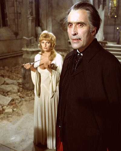 An image of Christopher Lee as Count Dracula and Stephanie Beacham as Jessica Van Helsing in Dracula A.D. 1972 available as a poster, photograph or aluminum metal print. Your satisfaction guaranteed.