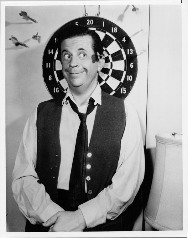 Milton Berle stands in front of dart board smiling 1970's 8x10 photo