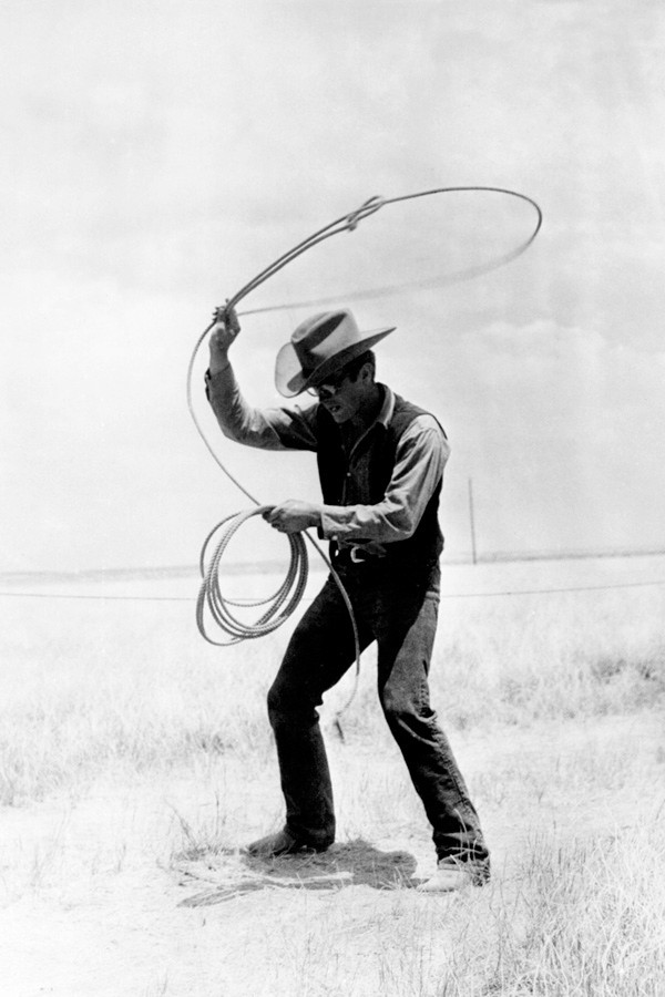 James Dean on set of Giant practicising lassoo with rope 8x12 inch real photo