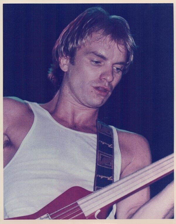 Sting plays guitar in white sleeveless shirt early 1980's Police era 8x10 photo