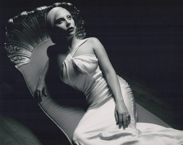 Lady Gaga vintage Hollywood look in white gown on chaize long 8x10 photo