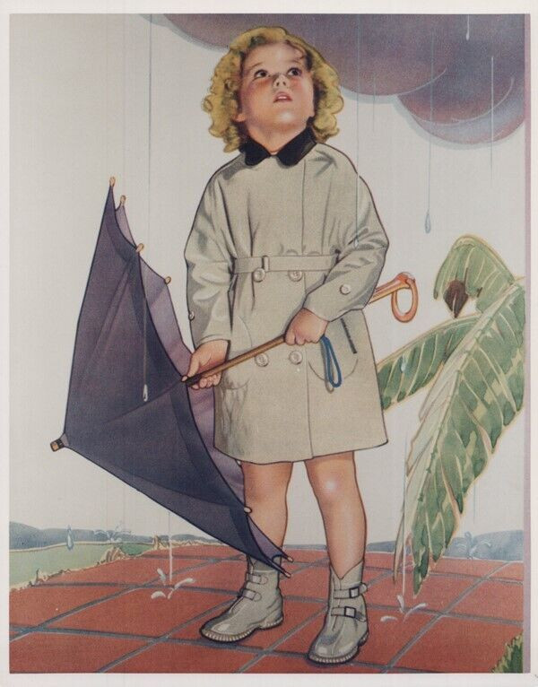 Shirley Temple vintage 8x10 color photo posing with umbrella in raincoat