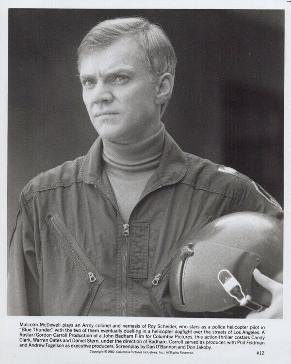 Malcolm McDowell 1982 original 8x10 photo holding helmet Blue Thunder