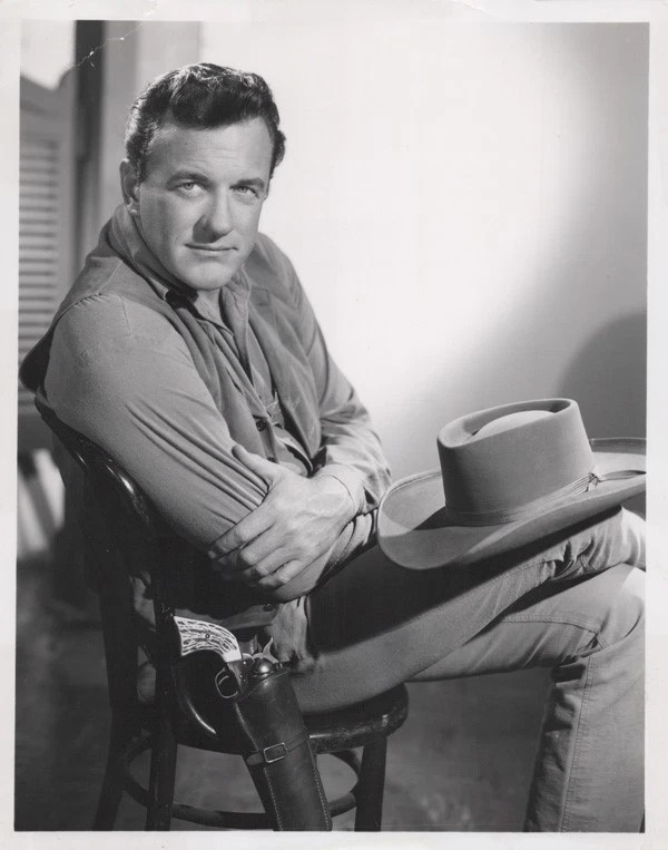 James Arness seated wearing his Colt Peacemaker Gunsmoke 8x10 inch photo