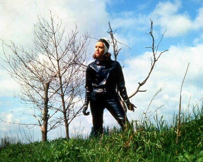 Diana Rigg wearing leather bike riding outfit and gloves The Avengers 8x10 photo
