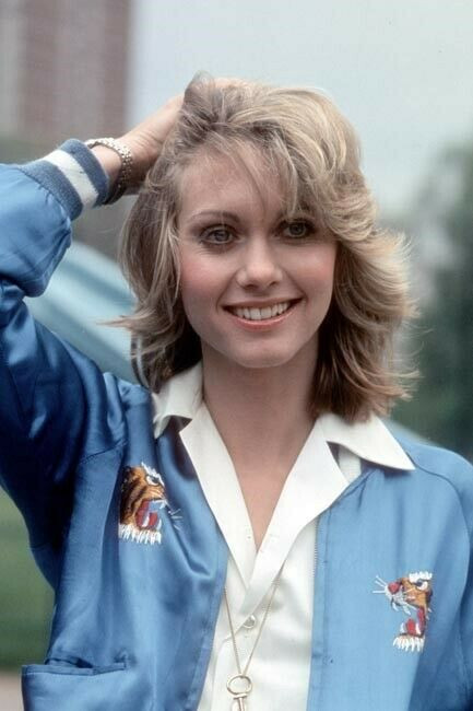 Olivia Newton John smiling pose in blue jacket hand in hair 4x6 inch photo