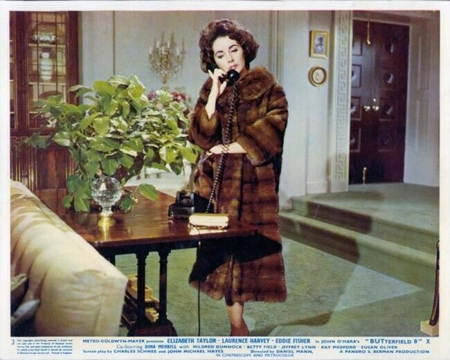 Elizabeth Taylor full length pose in fur coat on telephone Butterfield 8 8x10