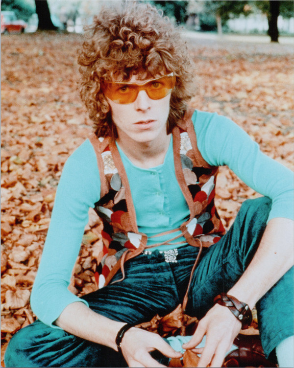David Bowie classic 1970's pose with glasses sitting in leaves 8x10 photo