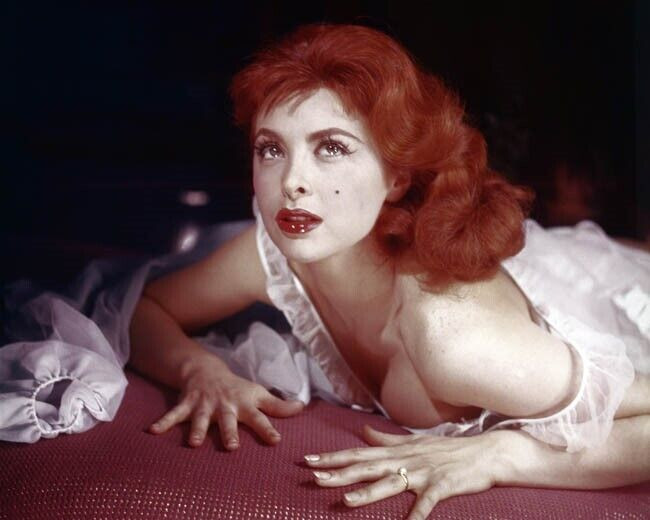 Tina Louise 1960's glamour pose with dress pulled down on bed 8x10 inch photo
