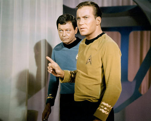 An image of William Shatner as Captain James Tiberius Kirk and DeForest Kelley as Dr. McCoy in Star Trek available as a poster, photograph or aluminum metal print. Your satisfaction guaranteed.