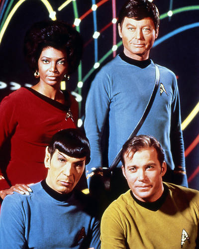 An image of William Shatner as Captain James T. Kirk/Dr. Janet Lester, Leonard Nimoy as Mr. Spock, DeForest Kelley as Dr. McCoy and Nichelle Nichols as Uhura in Star Trek available as a poster, photograph or aluminum metal print. Your satisfaction guaranteed.