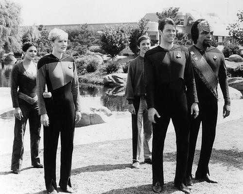 An image of Jonathan Frakes as Commander William T. Riker/Captain William T. Riker, Denise Crosby as Lieutenant Tasha Yar, Michael Dorn as Lieutenant Worf/Commander Worf and Marina Sirtis as Counselor Deanna Troi in Star Trek: The Next Generation available as a poster, photograph or aluminum metal print. Your satisfaction guaranteed.