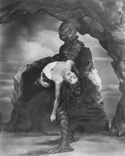 An image of Ben Chapman as Gill-Man, out of water and Julie Adams as Kay in Creature from the Black Lagoon available as a poster, photograph or aluminum metal print. Your satisfaction guaranteed.