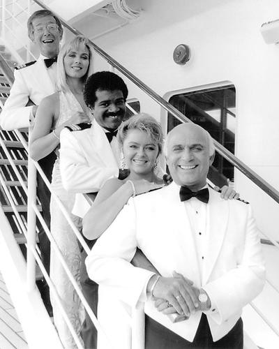 An image of Gavin MacLeod as Captain Merrill Stubing, Ted Lange as Bartender Isaac Washington and Jill Whelan as Vicki Stubing in The Love Boat available as a poster, photograph or aluminum metal print. Your satisfaction guaranteed.