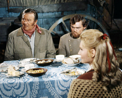 An image of John Wayne as Col. John Henry Thomas, Marian McCargo as Ann Langdon and Merlin Olsen as Cpl. Little George in The Undefeated available as a poster, photograph or aluminum metal print. Your satisfaction guaranteed.