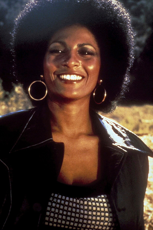 Pam Grier 1970's smiling portrait in black leather jacket tough girl look 8x12