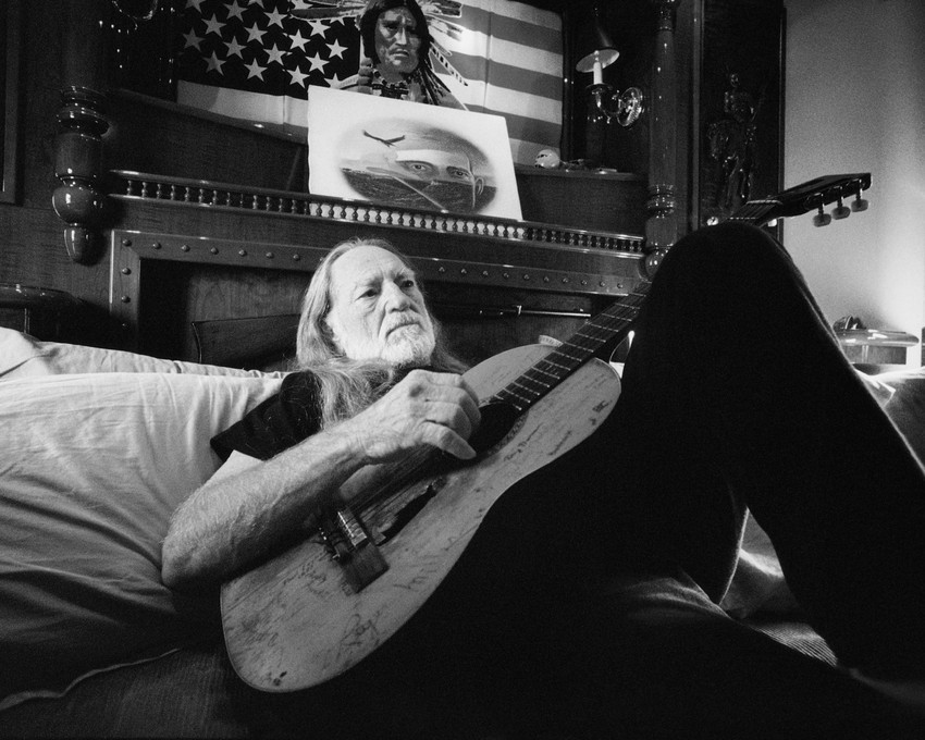 Willie Nelson lying on bed with guitar under American flag 12x18 Poster